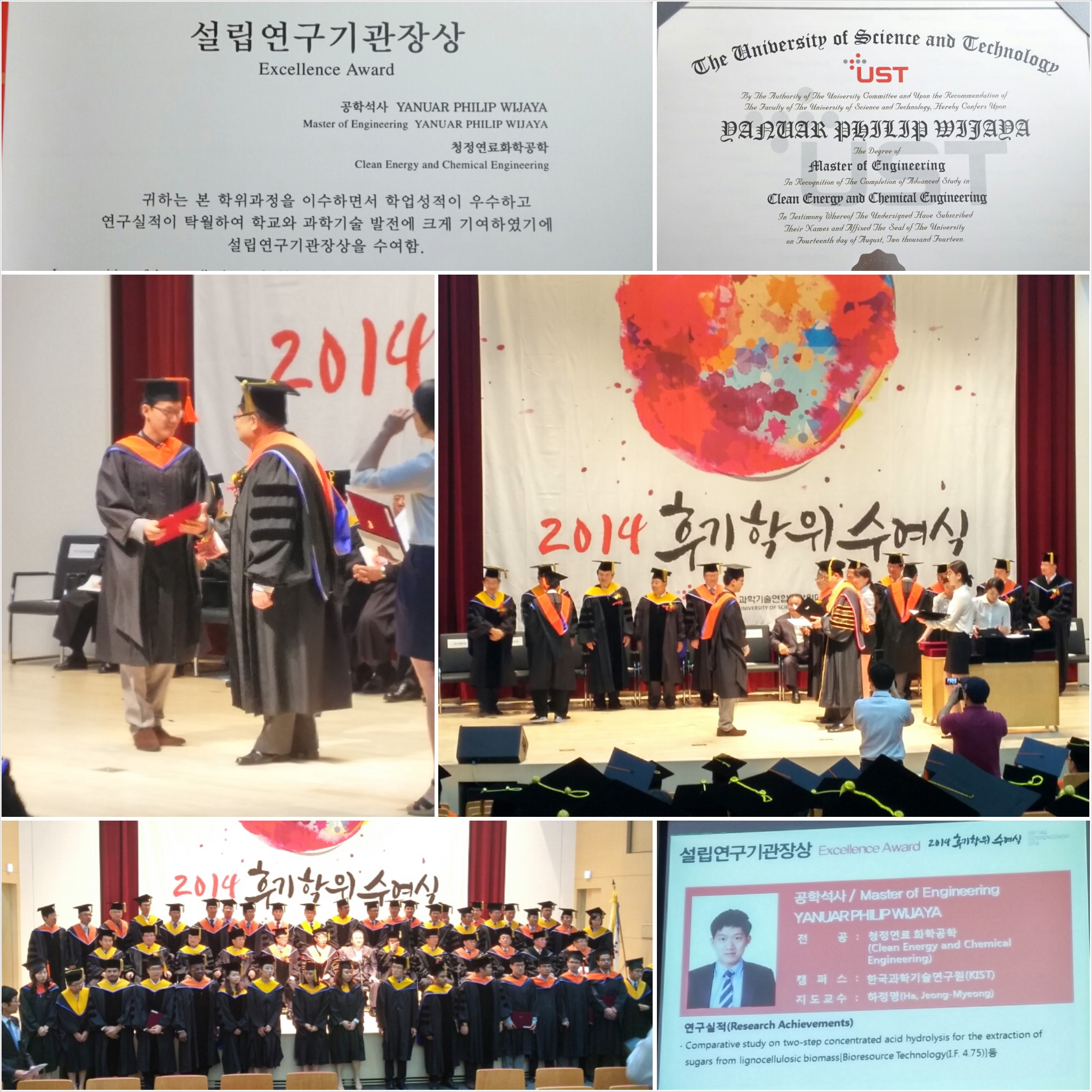 No words can best describe how happy I am today. Time has been running so fast, two years study is finally completed and I feel so blessed that my graduation day is marked with a truly wonderful and unforgettable memory witnessed by my beloved parents and lovely twin-sister: a privilege to deliver a speech as the winner of Academic Excellence Award in Fall Commencement 2014 at Korea Institute of Science and Technology (KIST), Seoul. Five days prior, we also celebrated the corresponding award in the graduation ceremony at Korea University of Science and Technology (UST), Daejeon.